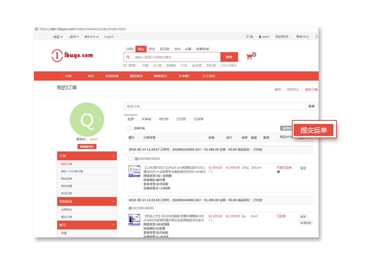或者通过国际转运填写商品信息直接提交订单到OneBuy平台会;员登陆后在 ‘会员中心’ → ‘国际转运’ → ‘仓库地址’中获取转运地址(此地址信息为您在淘宝、京东等电商平台下单时填写的收件地址信息)然后提交订单点提交后在OneBuy平台填写您购买的商品信息后提交即可!